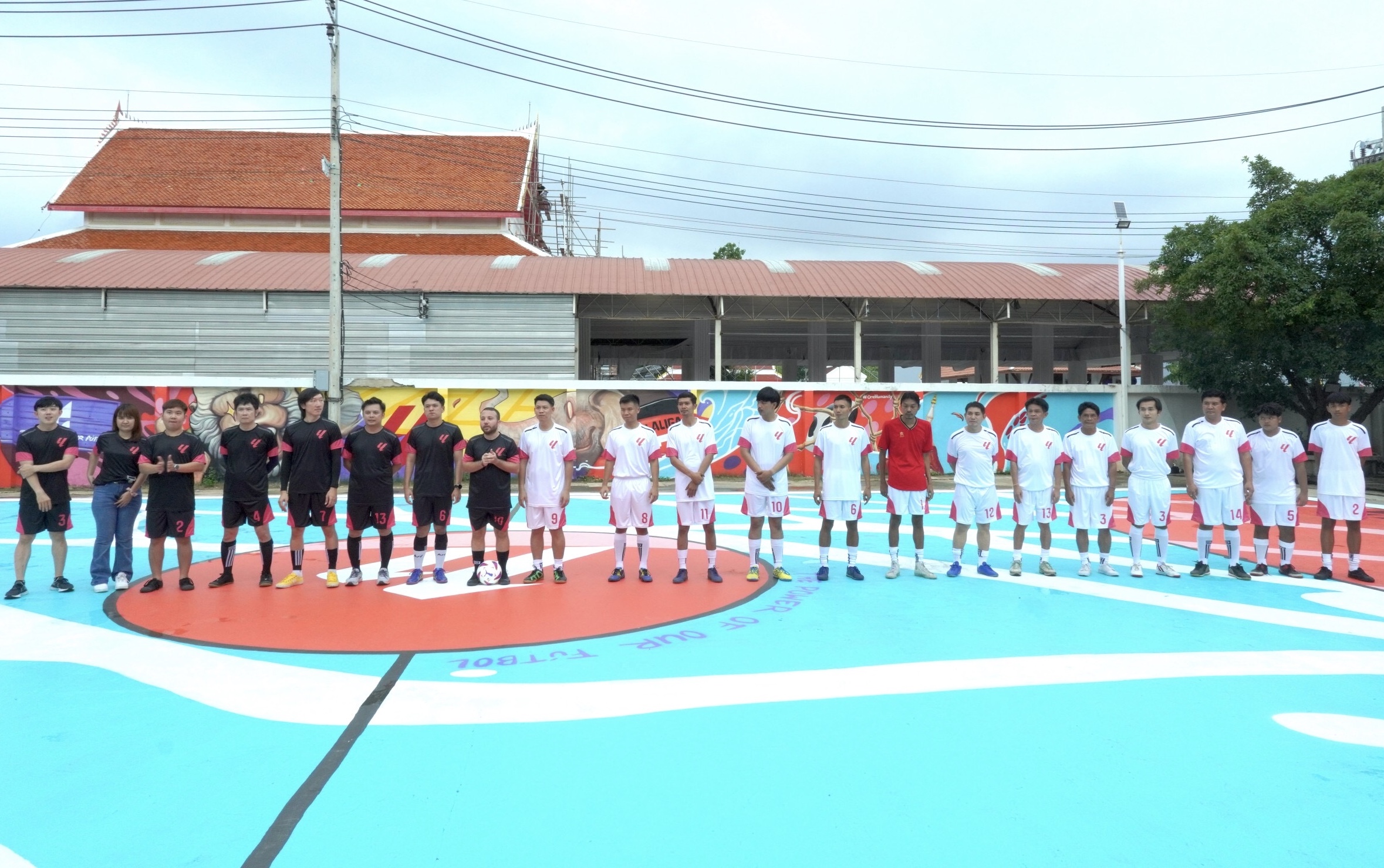 โดยสนามฟุตซอลแห่งนี้ ได้รับการเพนท์ ด้วยลวดลายที่สวยงาม มีทั้งภาพช้าง สัตว์คู่บ้านคู่เมืองของไทย ลูกฟุตบอลที่พุ่งตรงเข้าไปในตาข่าย ภาพเจดีย์เอียง ที่เป็นสัญลักษณ์ของเกาะเกร็ด รวมไปถึงภาพลิง ที่เป็นเสมือนลายเส้นสำคัญของศิลปินอย่างคุณมวย ภายใต้สีหลัก แดง และฟ้า สอดคล้องไปกับสีของโลโก้ใหม่ลาลีกา แทรกด้วยสีอื่น ๆ ตามสไตล์ของศิลปิน และความสอดคล้องของพื้นผิวสนาม ต่อเนื่องไปถึงกำแพงซึ่งสามารถกลายเป็นจุดเช็คอิน และสถานที่สำคัญอีกแห่งหนึ่งของนักท่องเที่ยวที่จะมาเยี่ยมเยือนเกาะ นอกเหนือจากการมาชมแหล่งที่ปั้นดินเผา เจดีย์เอียง แวะทานอาหารท้องถิ่น อย่าง ทอดมันหน่อกะลา