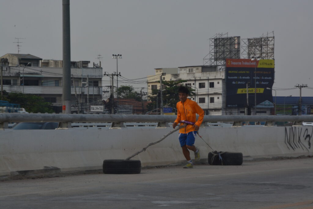 แต่ละวันเขามักจะวิ่งลากและดันยางรถยนต์ไปเป็นระยะทาง 400 เมตรแล้วก็วิ่งกลับ ทำซ้ำอยู่อย่างนี้นับชั่วโมง