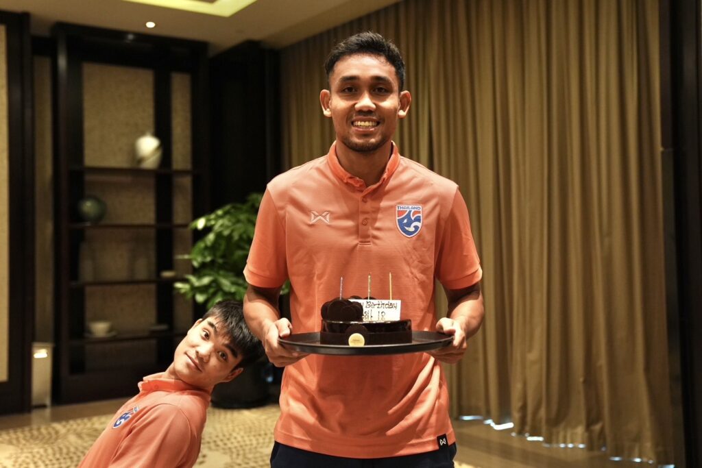 ส่วน ธีรศิลป์ แดงดา ที่มีอายุครบ 36 ปี ในวันนี้ กล่าวสั้น ๆ ว่า “ก่อนอื่นต้องขอบคุณ คุณแป้ง ครับ ที่ใส่ใจรายละเอียดกับนักฟุตบอลทุกคน พวกเราก็จะพยายามอย่างเต็มที่ครับ จะเก็บผลการแข่งขันที่ดีให้ได้ เพื่อทีม เพื่อคนไทย และ หวังว่าผมจะได้ของขวัญวันเกิด ดีที่สุดที่ผมเคยได้รับ เราจะสู้เพื่อ 3 แต้มครับ”