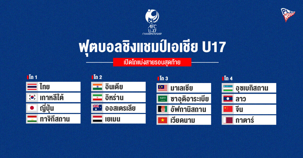 เอเอฟซี เปิดโถแบ่งสายฟุตบอลชิงแชมป์เอเชีย U17 รอบสุดท้าย ออกมาแล้ว โดย ไทย ในฐานะเจ้าภาพ อยู่โถ 1 อัตโนมัติ ร่วมกับ เกาหลีใต้, ญี่ปุ่น, ทาจิกีสถาน