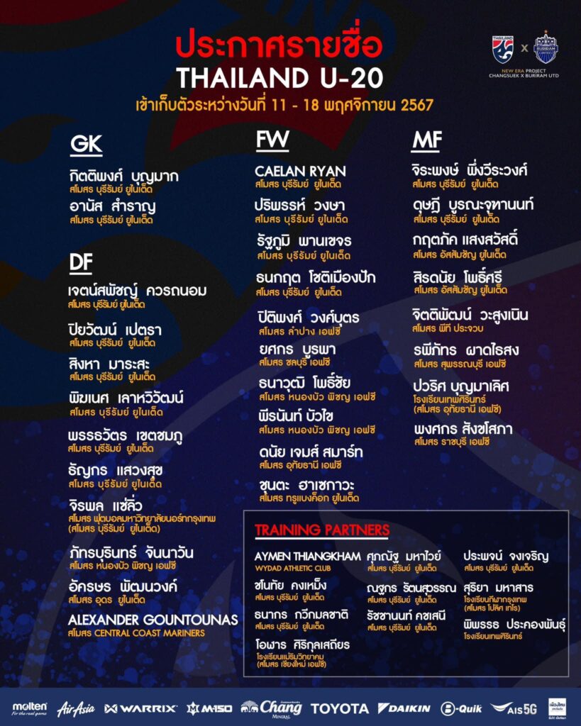 ทีมชาติไทย U20 ประกาศรายชื่อ 30 นักเตะ บวก 10 แข้งเทรนนิ่งพาร์ทเนอร์ เข้าเก็บตัวฝึกซ้อมระหว่างวันที่ 11- 18 พฤศจิกายนนี้ ณ แคมป์บุรีรัมย์ ยูไนเต็ด (บางบ่อ) จ.สมุทรปราการ