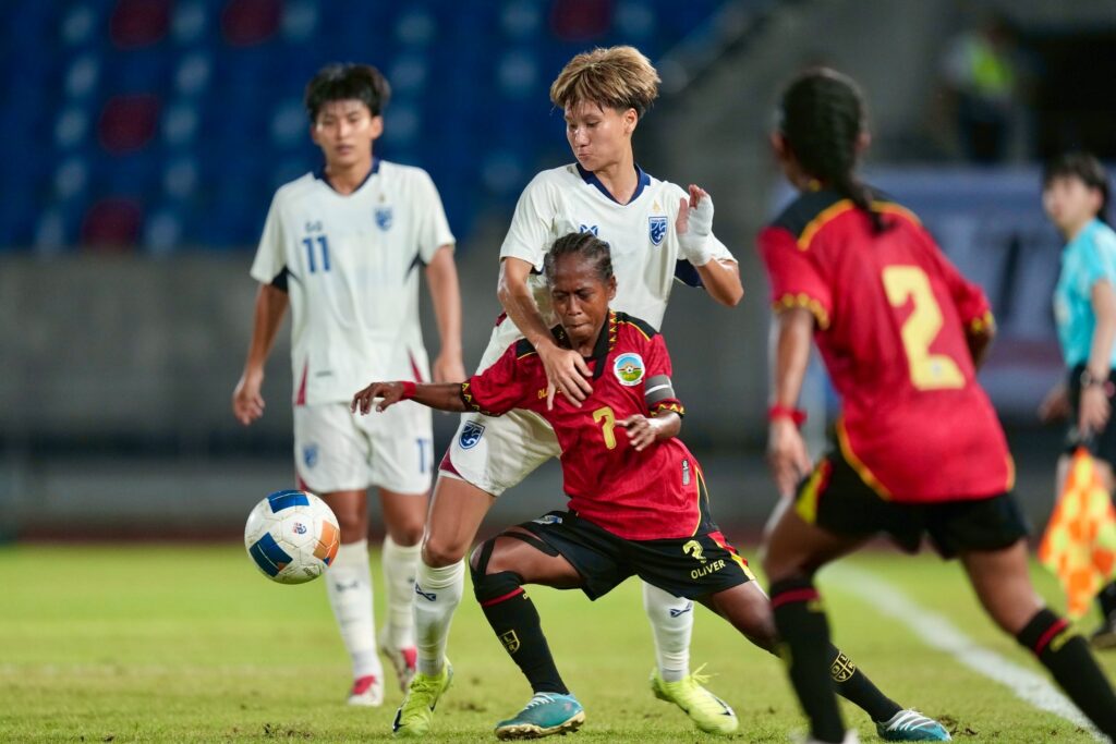 เริ่มเกมมาแค่สามนาที ไทย เกือบได้ประตูออกนำจากจังหวะที่ ธวันรัตน์ พรมทองมี เปิดเข้ากลางให้ ภัทรนันท์ อุปชัย จิ้มเปลี่ยนทางแต่ยังไปติดเซฟของ ประตูติมอร์ เลสเต
