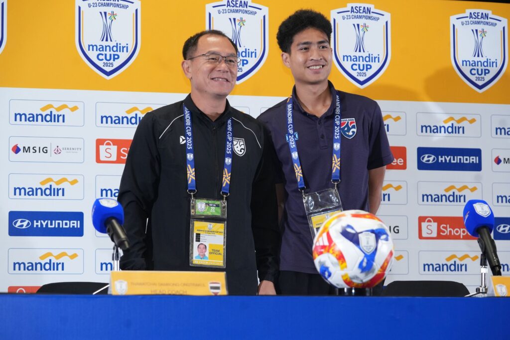 “โค้ชวัง” ธวัชชัย ดำรงอ่องตระกูล และ เสกสรรค์ ราตรี ร่วมแถลงข่าวก่อนเจอเจ้าภาพ อินโดนีเซีย ในศึกชิงแชมป์อาเซียน รุ่นอายุไม่เกิน 23 ปี รอบรองชนะเลิศ