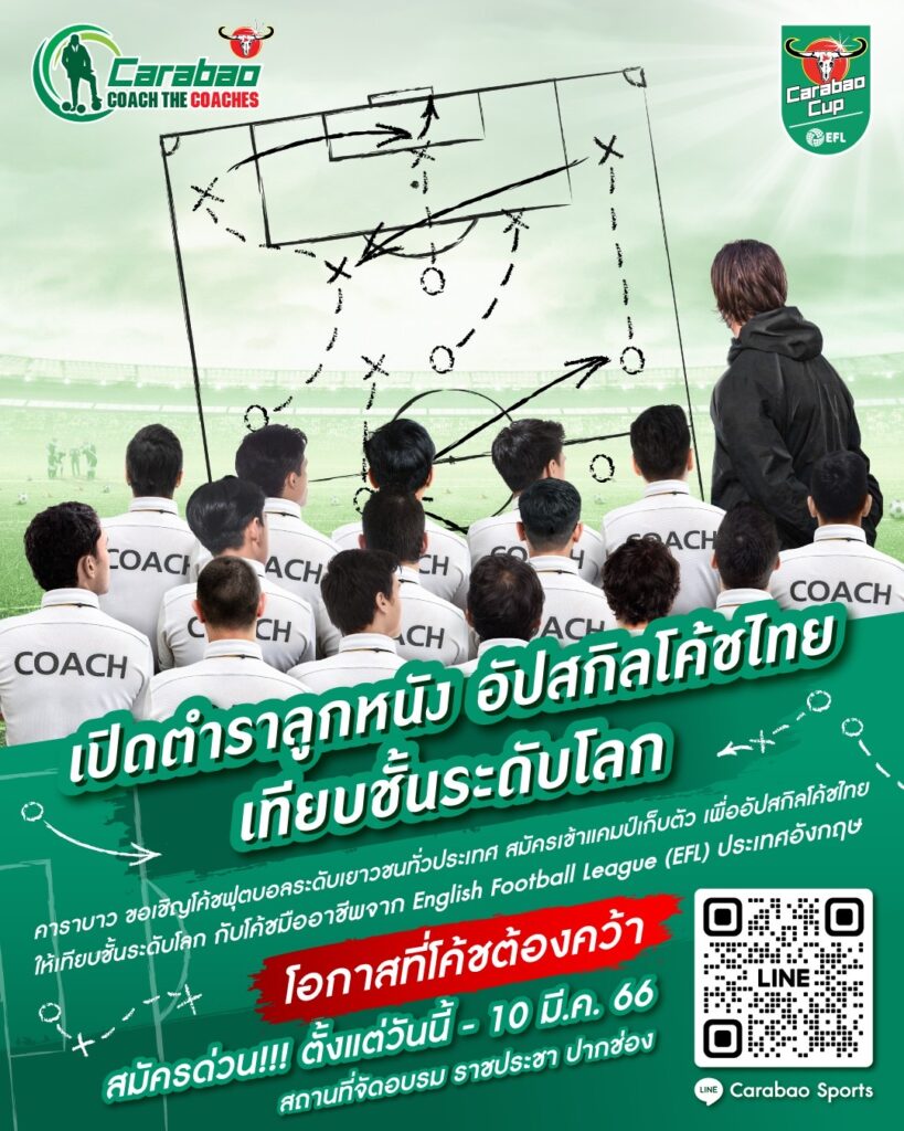 “คาราบาว” ขอเชิญโค้ชฟุตบอลระดับเยาวชนทั่วประเทศ สมัครเข้าแคมป์เก็บตัว เพื่ออัพสกิลโค้ชไทยให้เทียบชั้นระดับโลก กับโค้ชมืออาชีพจากอังกฤษ