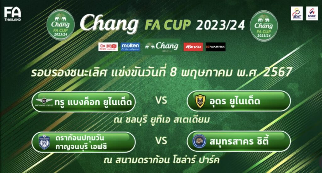 หนึ่งเดียวไทยลีก “แบงค็อก” เจอ “อุดร” ส่วน “กาญจนบุรี” บู๊ “สมุทรสาคร” รอบรองชนะเลิศฟุตบอลถ้วย “ช้าง เอฟเอ คัพ 2023/24” เตะที่สนามกลาง