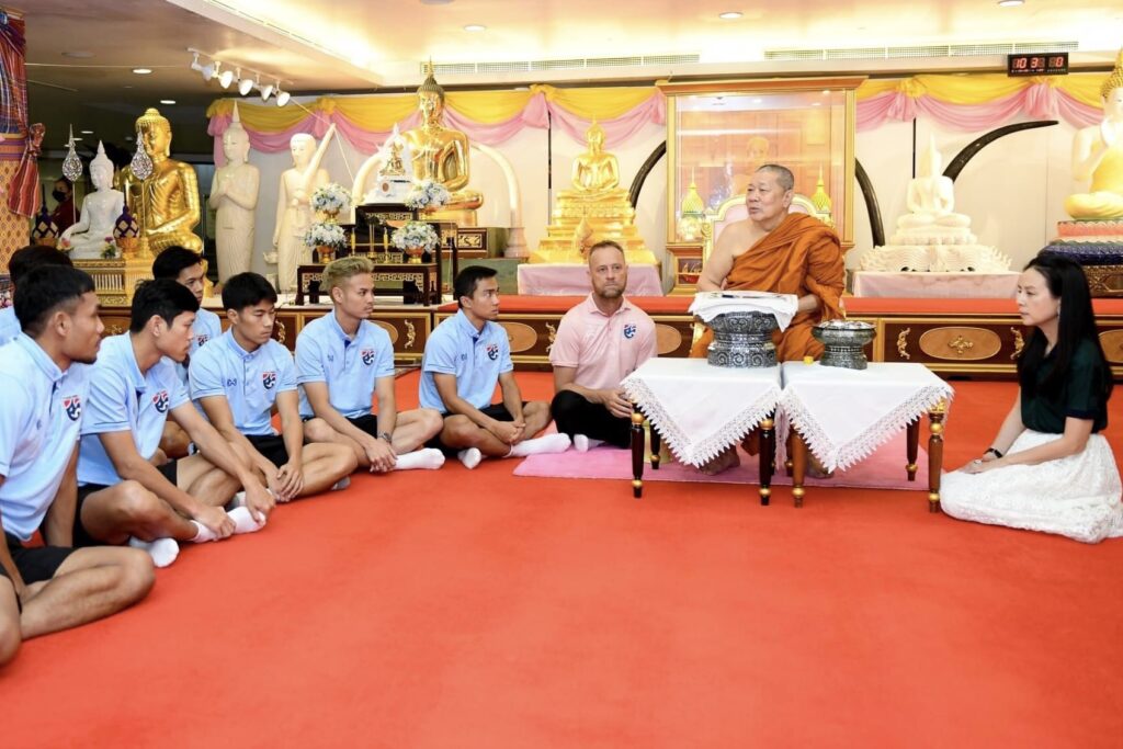 โดยการเข้านมัสการ “สมเด็จธงชัย” ในครั้งนี้นำโดย “มาดามแป้ง” นวลพรรณ ล่ำซำ ผู้จัดการทีมชาติไทย, มาโน โพลกิง เฮดโค้ช พร้อมด้วย นักเตะและทีมงานสตาฟฟ์โค้ช โดย “สมเด็จธงชัย” ได้พูดคุยกับทีมอย่างเป็นกันเอง พร้อมอวยพรให้ ทีมชาติไทย คว้าชัยชนะให้ได้ทั้ง 2 นัดแรก