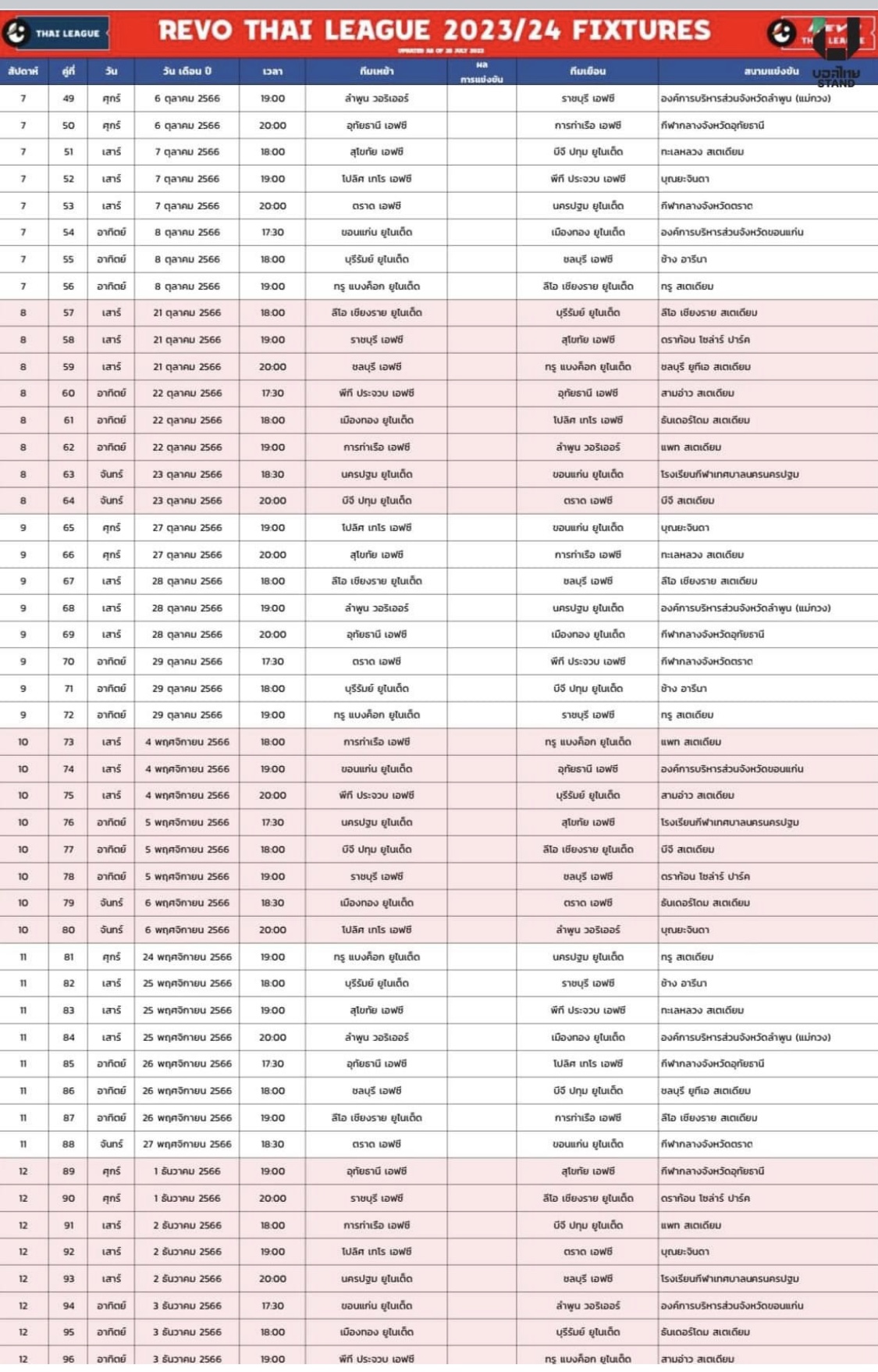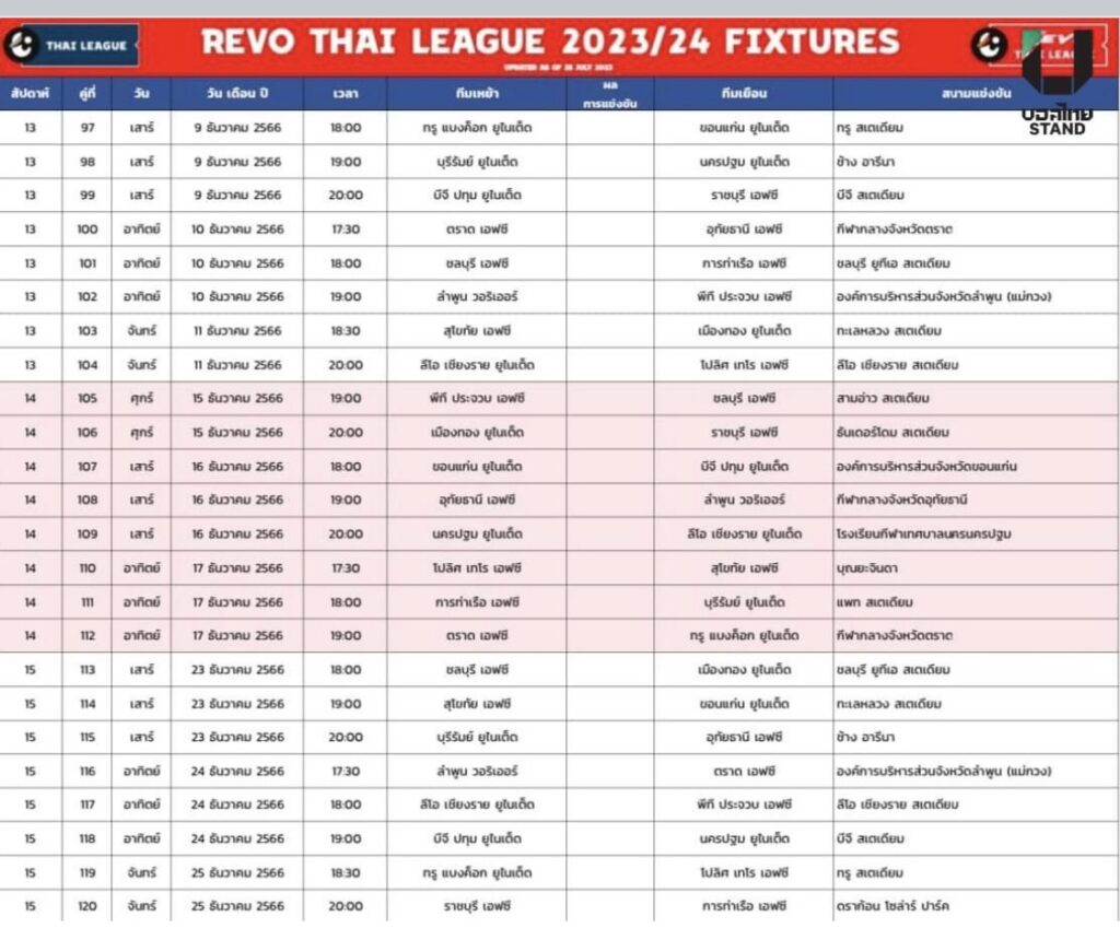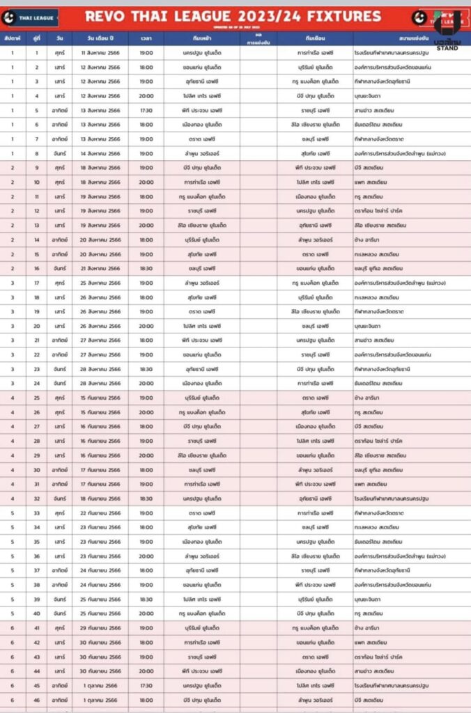 ไทยลีก ออกโปรแกรมฤดูกาล 2023/24 อย่างเป็นทางการแล้ว เฉพาะเลกแรก 11 ส.ค. – 25 ธ.ค. คู่เปิดหัว 11 นครปฐม พบ การท่าเรือ