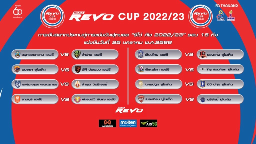 เมื่อวันที่ 8 ธันวาคม 2565 เวลา 14.00 น. ณ อาคารเฉลิมพระเกียรติ 7 รอบ การกีฬาแห่งประเทศไทย บริษัท ไทยลีก จำกัด ในฐานะฝ่ายจัดการแข่งขันฟุตบอลถ้วย รีโว่ คัพ 2022-23 ได้จัดพิธีจับสลากประกบคู่แข่งขัน รอบ 16 ทีม