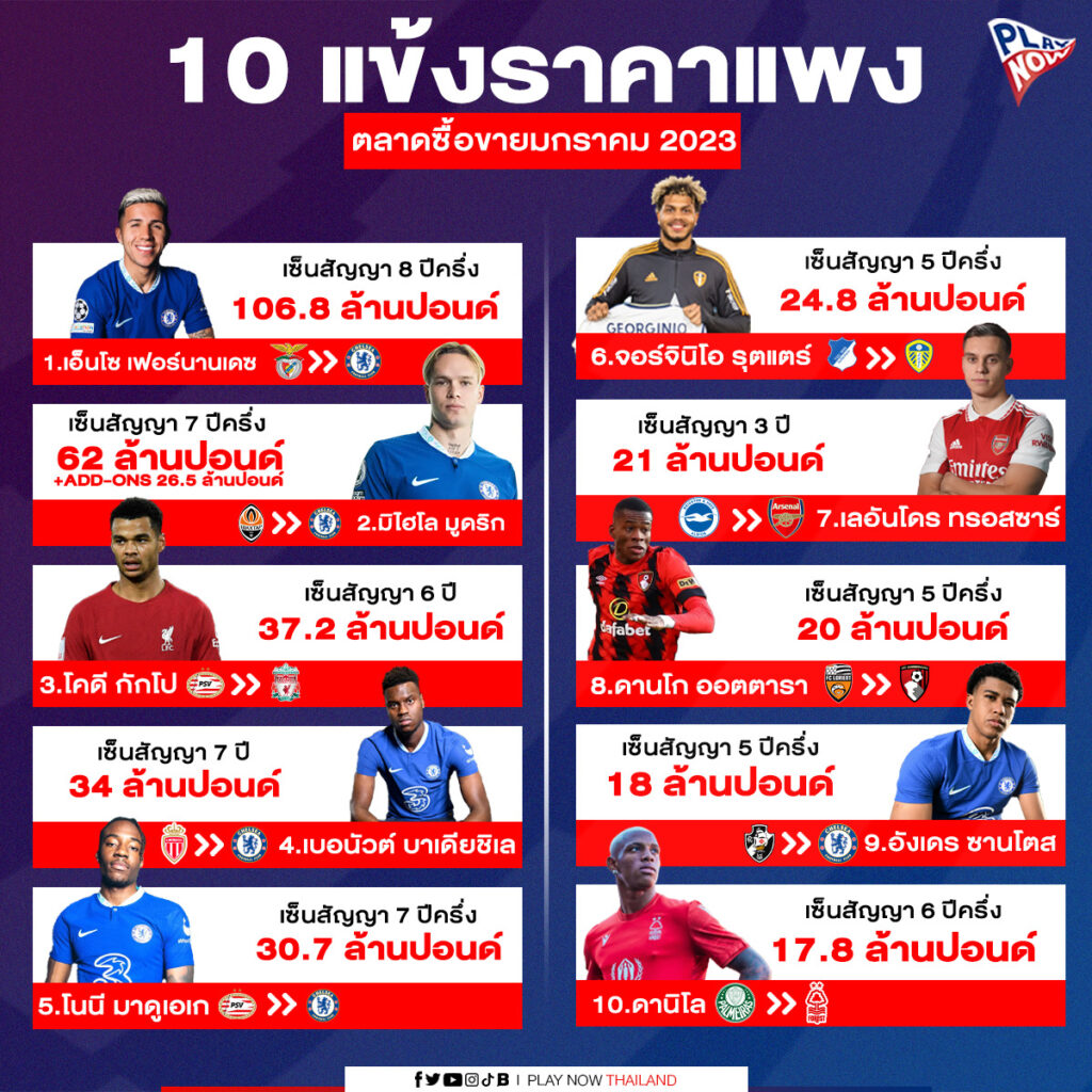 1.เอ็นโซ เฟอร์นานเดซ (เบนฟิกา ไป เชลซี) 106.8 ล้านปอนด์