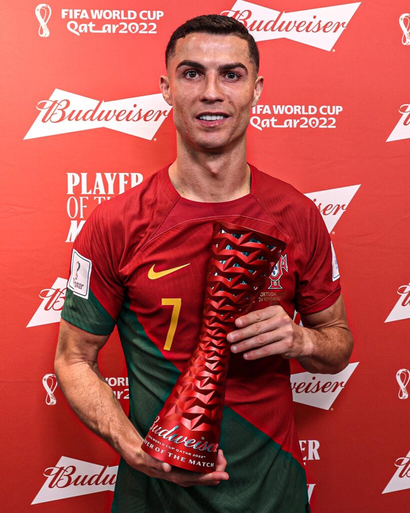 รวมฟุตบอลโลก 5 สมัย โรนัลโด ซัดไป 8 ประตู และยังมีโอกาสใส่สกอร์เพิ่มที่กาตาร์ โดยนัดต่อไป โปรตุเกส จะพบกับ อุรุกวัย ในคืนวันจันทร์ที่ 28 พฤศจิกายน ต่อด้วยพบ เกาหลีใต้ ในวันศุกร์ที่ 2 ธันวาคม