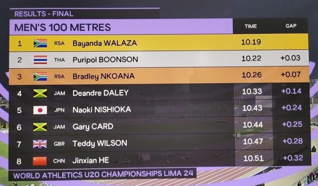 เหรียญทอง : บายันดา วาลาซา (แอฟริกาใต้) 10.19 วินาที