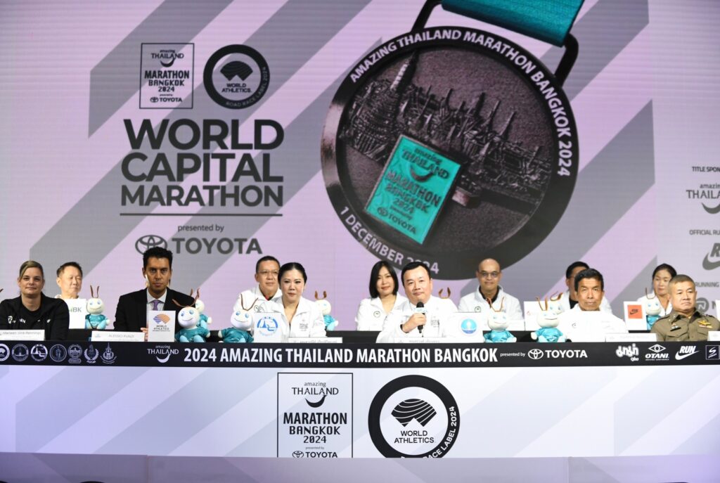 กระทรวงการท่องเที่ยวและกีฬา การท่องเที่ยวแห่งประเทศไทย จับมือ กรุงเทพมหานคร, สมาคมกรีฑาโลก, การกีฬาแห่งประเทศไทย และ ไทยแลนด์ไตรลีก แถลงความพร้อมจัดศึกวิ่งมาราธอนส่งเสริมการท่องเที่ยว “วิ่งผ่าเมือง ครั้งที่ 7” รายการ “อะเมซิ่ง ไทยแลนด์ มาราธอน แบงค็อก 2024 พรีเซ็นต์บาย โตโยต้า” ชิงถ้วยพระราชทานพระบาทสมเด็จพระเจ้าอยู่หัว สมเด็จพระนางเจ้าฯ พระบรมราชินี และสมเด็จพระเจ้าลูกเธอ เจ้าฟ้าพัชรกิติยาภาฯ ชิงเงินรางวัลรวม 2,440,500 บาท ในวันอาทิตย์ที่ 1 ธ.ค.นี้ มีนักวิ่งจาก 77 ประเทศทั่วโลก แห่สมัครร่วมแข่งขันมากเป็นประวัติการณ์ 3.3 หมื่นคน