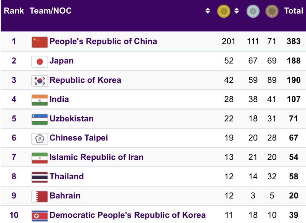 ส่วนอันดับ 2 ญี่ปุ่น เจ้าภาพในครั้งต่อไป ตามมาห่าง ๆ คว้าไป 52 ทอง 61 เงิน 69 ทองแดง และอันดับ 3 เกาหลีใต้ 42 ทอง 59 เงิน 89 ทองแดง