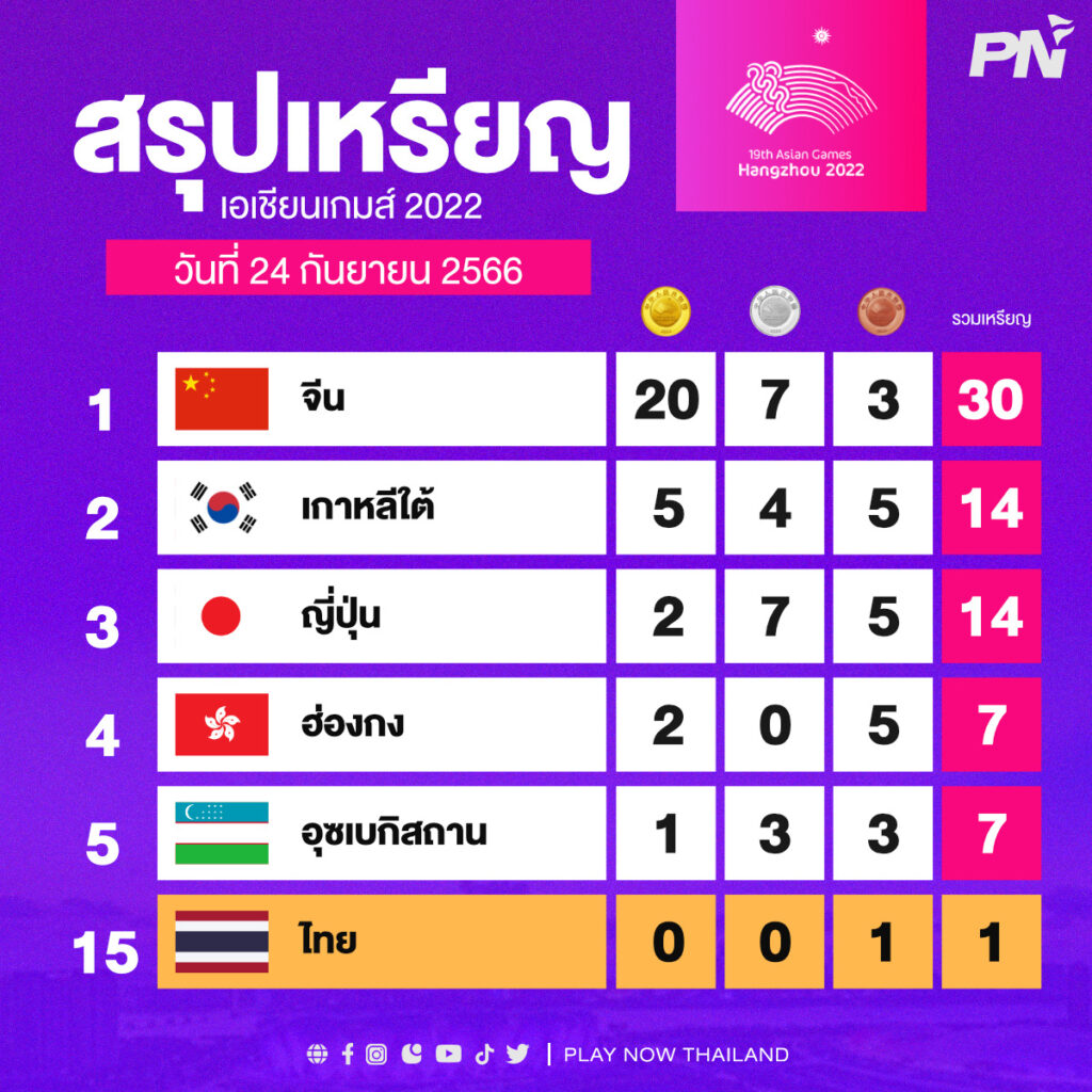 ไทย ประเดิมเอเชียนเกมส์ คว้าได้ 1 ทองแดงจากเรือพายหญิงคู่ รั้งอันดับ 15 ของตาราง โดยเจ้าภาพ จีน โกยไปแล้ว 20 เหรียญทอง นำจ่าฝูง
