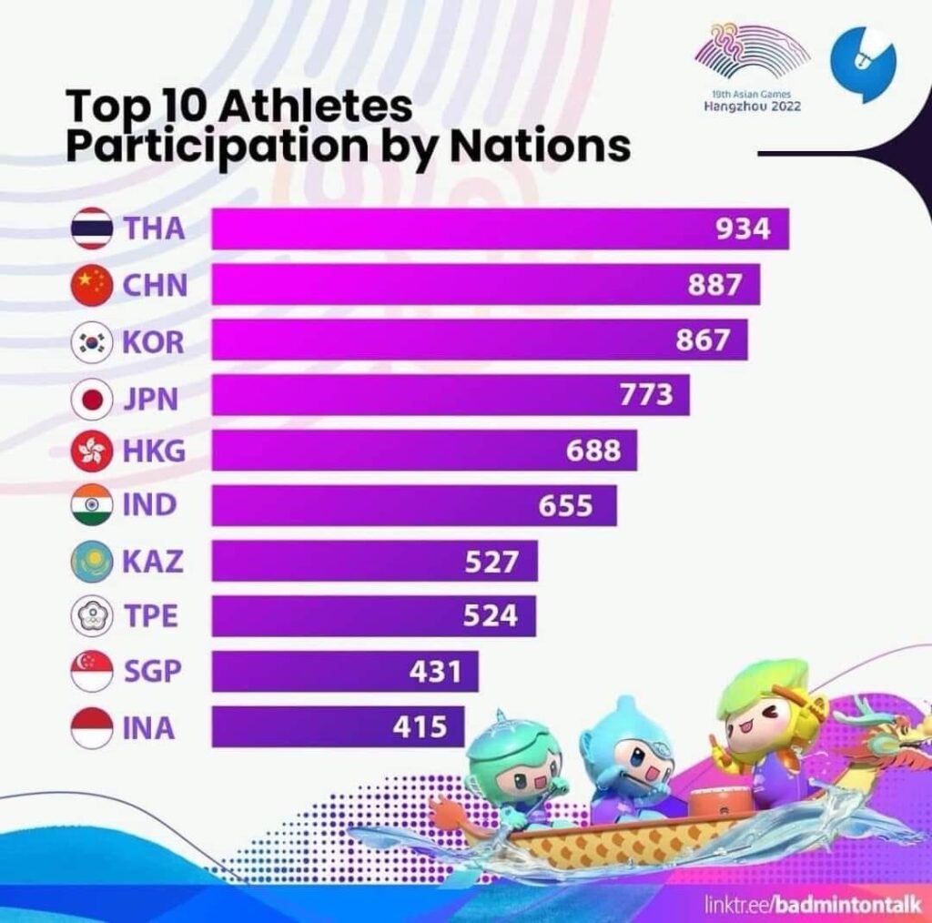 สำหรับ “หางโจว 2022” มี 45 ชาติทั่วเอเชียเข้าร่วมชิงชัย 40 ชนิดกีฬา 481 เหรียญทอง โดย ไทย ส่งนักกีฬาเข้าแข่งขันมากที่สุด 934 คน มากกว่าเจ้าภาพ จีน ที่ส่ง 887 คน