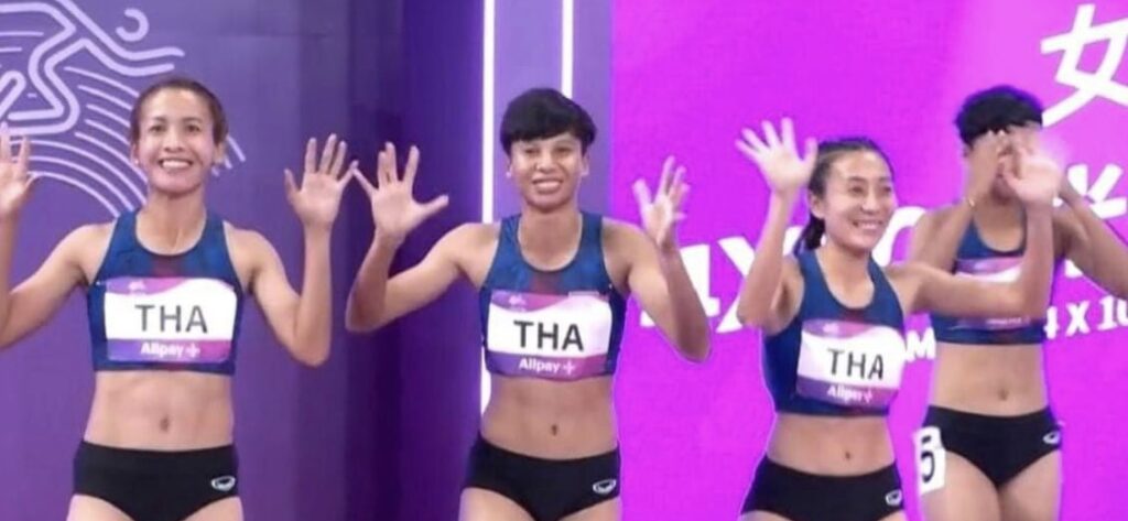 กรีฑา เอเชียนเกมส์ ครั้งที่ 19 วันที่ 3 ตุลาคม 2566 ไฮไลต์ในประเภทวิ่งผลัด 4×100 เมตร เริ่มที่ทีมหญิง ไทย ส่งไม้ 1 “ลูกกบ” สุภาวรรณ ธิปัตย์, ไม้ 2 “น่าน” ศุภานิข พูลเกิด, ไม้ 3 “มายด์” อรอุมา เชษฐา และไม้ 4 “ถู” สุกานดา เพ็ชรรักษา สามารถเข้าเส้นชัยเป็นลำดับที่ 2 คว้าเหรียญเงิน สถิติ 44.32 วินาที