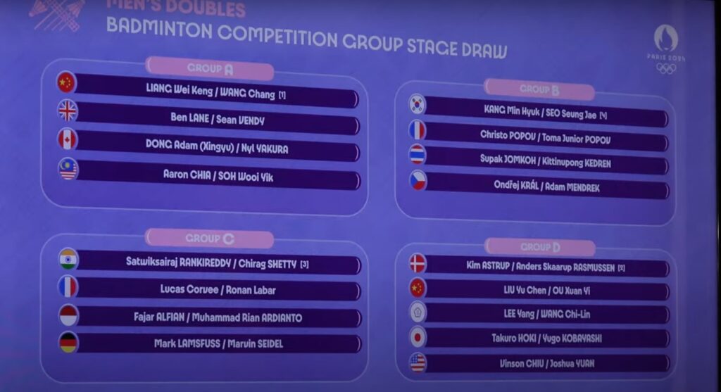 โดยเมื่อวันศุกร์ที่ผ่านมา ได้มีการจับสายไป 4 ประเภท ยกเว้นประเภทชายคู่ หลังจากศาลอนุญาโตตุลาการกีฬา (CAS) มีประเด็นที่ให้สิทธิ์ชายคู่จากฝรั่งเศส สามารถได้รับไวด์การ์ด (Wild Card) เข้าร่วมการแข่งขันโอลิมปิก ซึ่งปกติแล้ว จะมีกันทั้งสิ้น 16 คู่ แต่เกิดความผิดพลาดจาก BWF ในขั้นตอนการคำนวนคะแนนจนทำให้เกิดความสับสน ทำให้ต้องเลื่อนการจับสลากในประเภทนี้ออกไป ก่อนจะได้รับสิทธิ์เป็นคู่ที่ 17 ซึ่งจะมีนักแบดมินตัน 5 คนอยู่ในกลุ่มเดียวกัน