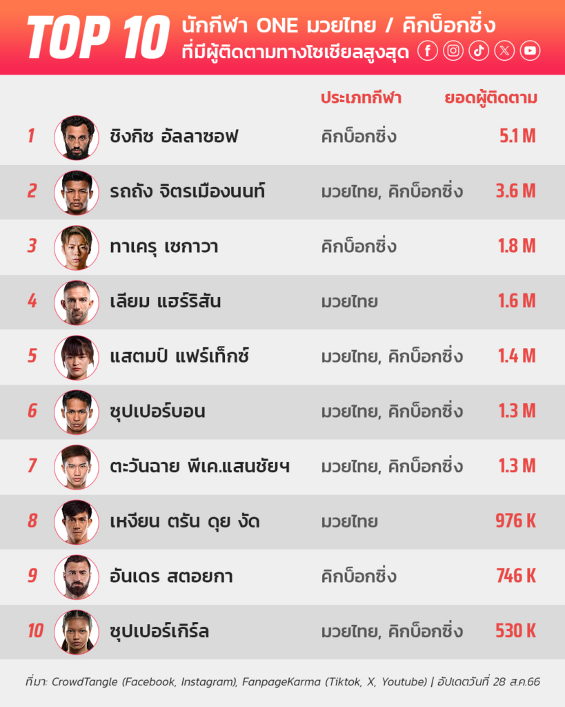 วันนี้เราจึงขออาสาพาส่อง 10 อันดับนักกีฬา ONE ที่ผู้มียอดติดตามทางโซเชียลสูงสุด โดยมีนักกีฬาไทยติดอันดับถึง 5 คน