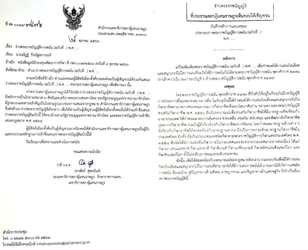 ตามที่ นายวันมูหะมัดนอร์ มะทา ประธานสภาผู้แทนราษฎร ได้วินิจฉัยร่างพระราชบัญญัติการพนัน(ฉบับที่…) พ.ศ…. มีหลักการเป็นไปตามหมวดที่ 3 สิทธิเสรีภาพของปวงชนชาวไทย ของรัฐธรรมนูญแห่งราชอาณาจักรไทย มีรูปแบบและสาระสำคัญเป็นไปตามรูปแบบของการเสนอกฎหมาย และปรากฏตามพระราชบัญญัติการเข้าชื่อเสนอกฎหมาย พ.ศ.2564 นั้น