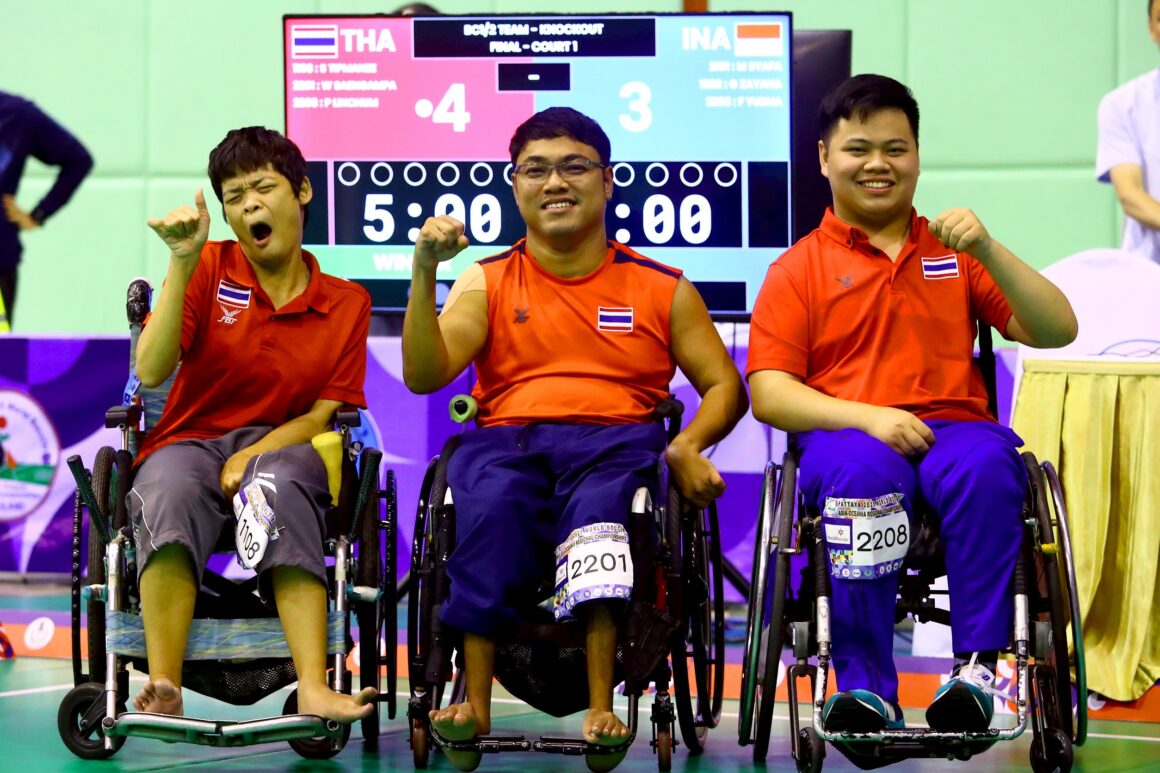 ในประเภททีม BC1/2 สามนักบอคเซียไทย “เจมส์” วรวุฒิ แสงอำภา, “เขียว” ภาคภูมิ ลินชุม และ สุบิน ทิพย์มะณี โชว์ฟอร์มได้เข้าขาจนเอาชนะ ทีมอินโดนีเซีย ไปได้ 4-3 คว้าเหรียญทองส่งท้ายได้สำเร็จ