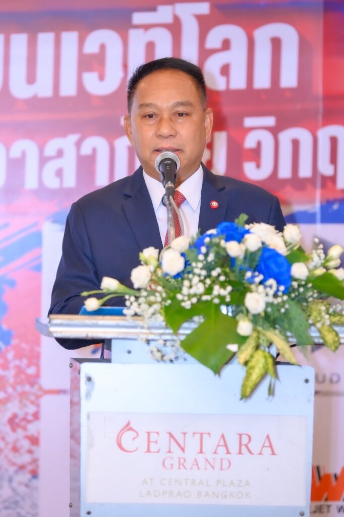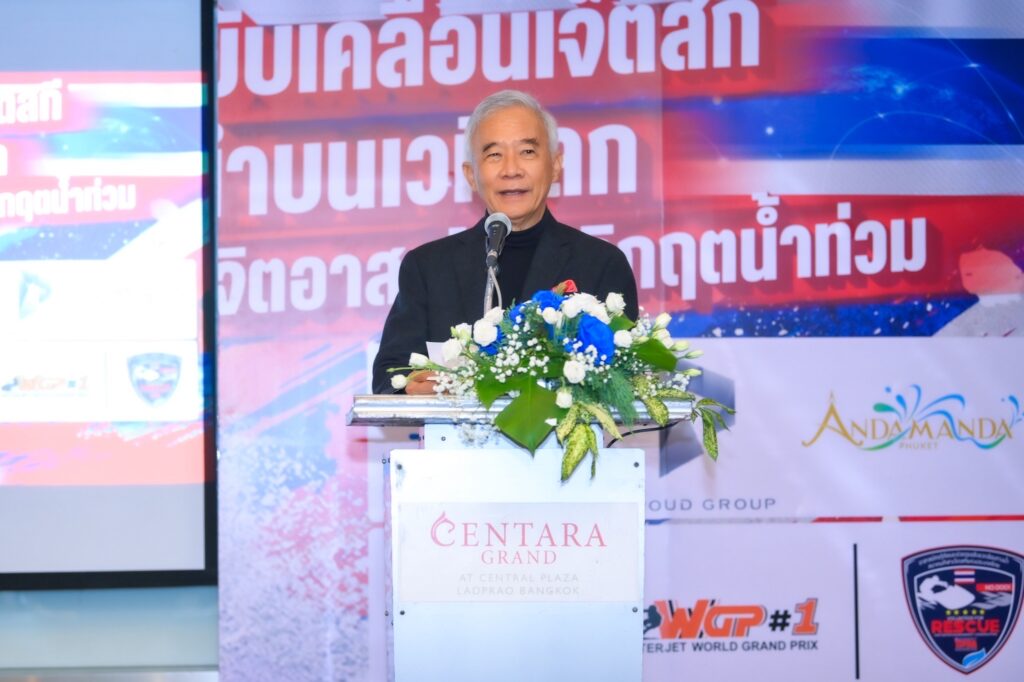 นายสุวัจน์ ลิปตพัลลภ อดีตรองนายกรัฐมนตรี และประธานที่ปรึกษา กล่าวว่า “ผมได้เห็นการเติบโตที่น่าทึ่งของสมาคมกีฬาเจ็ตสกีแห่งประเทศไทยฯ ที่มีแนวคิดในการส่งเสริมการสร้างแบรนด์ทัวร์นาเม้นท์กีฬาเจ็ตสกีอาชีพของไทย ออกไปแข่งขันบนเวทีโลก กับชาวต่างชาติ และกำลังประสบความสำเร็จในการเป็นผู้นำบนเวทีโลก เป็นสิ่งที่น่าชื่นชมอย่างยิ่ง ที่สำคัญได้สร้างประโยชน์ด้านมูลค่าทางเศรษฐกิจ โดยนำนักกีฬาทั่วโลก เข้ามาแข่งขันในประเทศไทยทุกปีเดือนธันวาคม ปีล่าสุด สร้างเงินหมุนเวียนทางเศรษฐกิจ ซึ่งวิเคราะห์ผลกระทบทางเศรษฐกิจอย่างเป็นทางการ โดยมหาวิทยาลัยกีฬาแห่งชาติกว่า 650 ล้านบาท ในทัวร์นาเม้นท์เวิลด์คัพ ที่พัทยา คำถามคือคนไทยขึ้นไปเป็นผู้นำโลกได้อย่างไร และภาครัฐควรให้การสนับสนุนต่อยอดอย่างไร ในเมื่อแบรนด์กีฬาไทย พัฒนาตัวเองจนขึ้นไปเป็นผู้นำประเทศสมาชิกทั่วโลก 55 ชาติ สร้างโอกาสขยายตัวอย่างต่อเนื่อง ยังไม่รวมกับประโยชน์ของระบบเศรษฐกิจห่วงโซ่ในกีฬาอาชีพ ที่จะสร้างเม็ดเงินและงานประชาสัมพันธ์อีกหลายเท่าตัว และอีกหนึ่งสิ่งที่ผมชื่นชมเป็นอย่างยิ่ง คือการที่สมาคมฯ ไม่ได้หยุดอยู่เพียงมิติของการแข่งขันกีฬาแต่ยังมีบทบาทสำคัญในด้านสังคม โดยเฉพาะการลงพื้นที่ช่วยเหลือผู้ประสบภัยน้ำท่วมในช่วงปลายปีที่ผ่านมา ซึ่งได้รับเสียงชื่นชมจากทั่วประเทศ จนเกิดเป็น ‘โครงการอาสากู้ภัยและดูแลสิ่งแวดล้อมทางน้ำ’ ที่เกิดจากความร่วมมือระหว่างสมาคมฯ และกลุ่มบริษัทพราว ถือเป็นอีกหนึ่งก้าวสำคัญของการนำนวัตกรรมและพลังของภาคเอกชนมาสนับสนุนระบบกู้ภัยของประเทศ พร้อมสร้างเครือข่ายอาสาสมัครที่มีความพร้อมทั้งทักษะ ความเสียสละ และจิตอาสา ในฐานะที่ปรึกษาโครงการ ผมเห็นว่าความร่วมมือนี้ไม่เพียงแต่ตอบสนองต่อเหตุการณ์ฉุกเฉินทางน้ำได้อย่างทันท่วงทีแต่ยังเป็นต้นแบบของการเชื่อมโยง ‘กีฬา สิ่งแวดล้อม และเยาวชน’ เข้าไว้ด้วยกันอย่างยั่งยืน ซึ่งสอดคล้องกับแนวทางการพัฒนาประเทศในระยะยาวได้อย่างน่าภาคภูมิใจ”