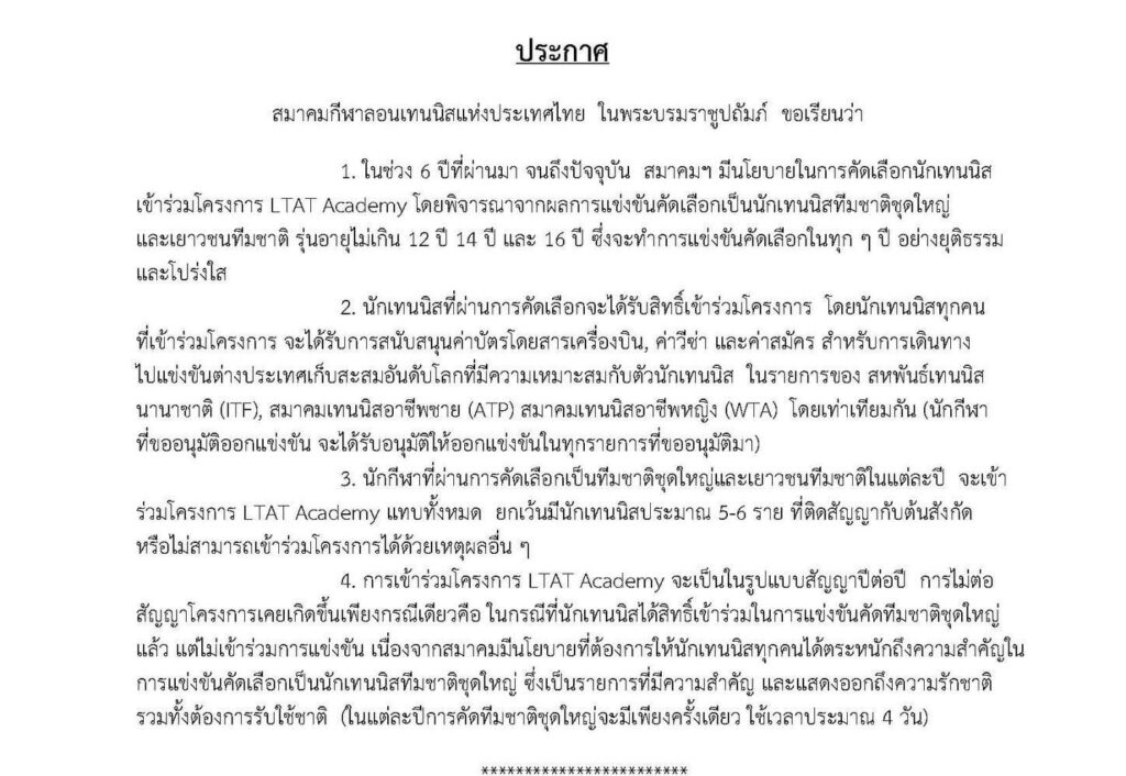 1. ในช่วง 6 ปีที่ผ่านมา จนถึงปัจจุบัน สมาคมฯ มีนโยบายในการคัดเลือกนักเทนนิสเข้าร่วมโครงการ LTAT Academy โดยพิจารณาจากผลการแข่งขันคัดเลือกเป็นนักเทนนิสทีมชาติชุดใหญ่ และเยาวชนทีมชาติ รุ่นอายุไม่เกิน 12 ปี 14 ปี และ 16 ปี ซึ่งจะทำการแข่งขันคัดเลือกในทุกๆ ปี อย่างยุติธรรมและโปร่งใส