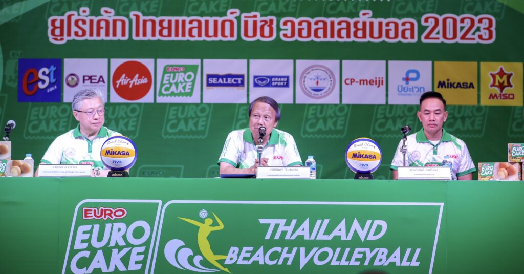 นายสมพร ใช้บางยาง นายกสมาคมกีฬาวอลเลย์บอลแห่งประเทศไทย พร้อมด้วย นายสมชาย เวชากร ประธานกรรมการบริหาร บริษัท ยูโรเปี้ยนฟู้ด จำกัด (มหาชน) ผู้สนับสนุน และ นายศิรสิทธิ์ สมศรีทอง นายกเทศมนตรีตำบลไชยวาน ร่วมแถลงข่าวการแข่งขัน “ยูโร่เค้ก ไทยแลนด์ บีช วอลเลย์บอล 2023” ครั้งที่ 10 ณ ห้องบุหงา โรงแรมโกเด้น ทิวลิป ซอฟเฟอริน กรุงเทพ เมื่อวันที่ 12 ธันวาคม 2566